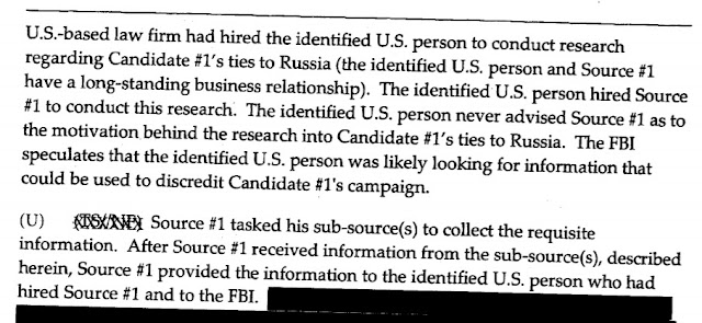 The FISA application notes an “identified U.S. person” (Fusion GPS’s Glenn Simpson) and “Source #1” (Christopher Steele) but never disclosed the fact that the DNC and the Clinton campaign had funded — through the law firm of Perkins Coie — Steele’s activities. The application instead tosses an oblique reference to Simpson’s motivation (“was likely looking for information that could be used to discredit [Trump’s] campaign”). In other words, the FBI hid from the court the fact that the Democrat apparatus was funding Steele’s activities and that all of his work product needed to be viewed through the lens of a partisan hit-job.