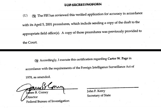 FBI director James Comey certified the accuracy and completeness of the FISA application targeting Carter Page by signing the document. He essentially stated that the Steele Dossier was verified as true. He lied. Because just a few months later, he stated — under oath — that the Dossier was “salacious and unverified“.