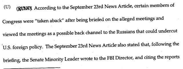 The application goes on to reference a Michael Isikoff article in Yahoo! News that described Page’s alleged activities and possible collusion by the Trump campaign with Russia. This information is treated as a separate piece of evidence in the bogus application, but was just laundered material from Steele to Isikoff.